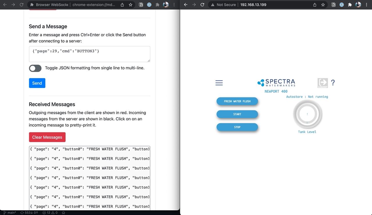 {"page":12,"cmd":"BUTTON0"}There's no authentication or anything fancy, so we can bypass the client completely and just talk to the Spectra unit directly by sending those same commands. The websocket connection details are at the top of the app source code, and I used a Chrome Browser Websocket Client to open a new connection and test sending and receiving messages back and forth.
