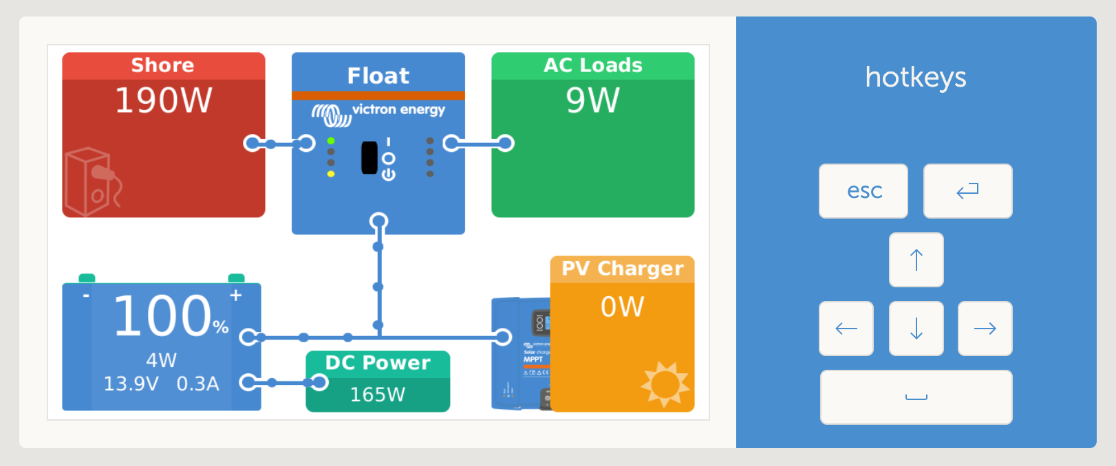 The core of the system is a Victron Cerbo GX running Venus OS, a Victron BMV712 to manage batteries, and a Victron MPPT to manage solar panels. By itself, the Cerbo is already a wonderful device with a touchscreen to see/manage all the systems on the boat; which can also be conveniently connected to the local network and accessed over any web browser if you're not near the device itself.