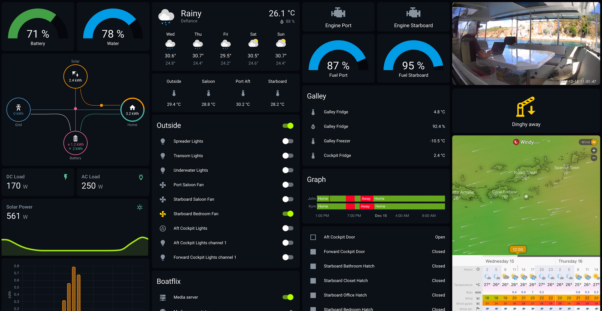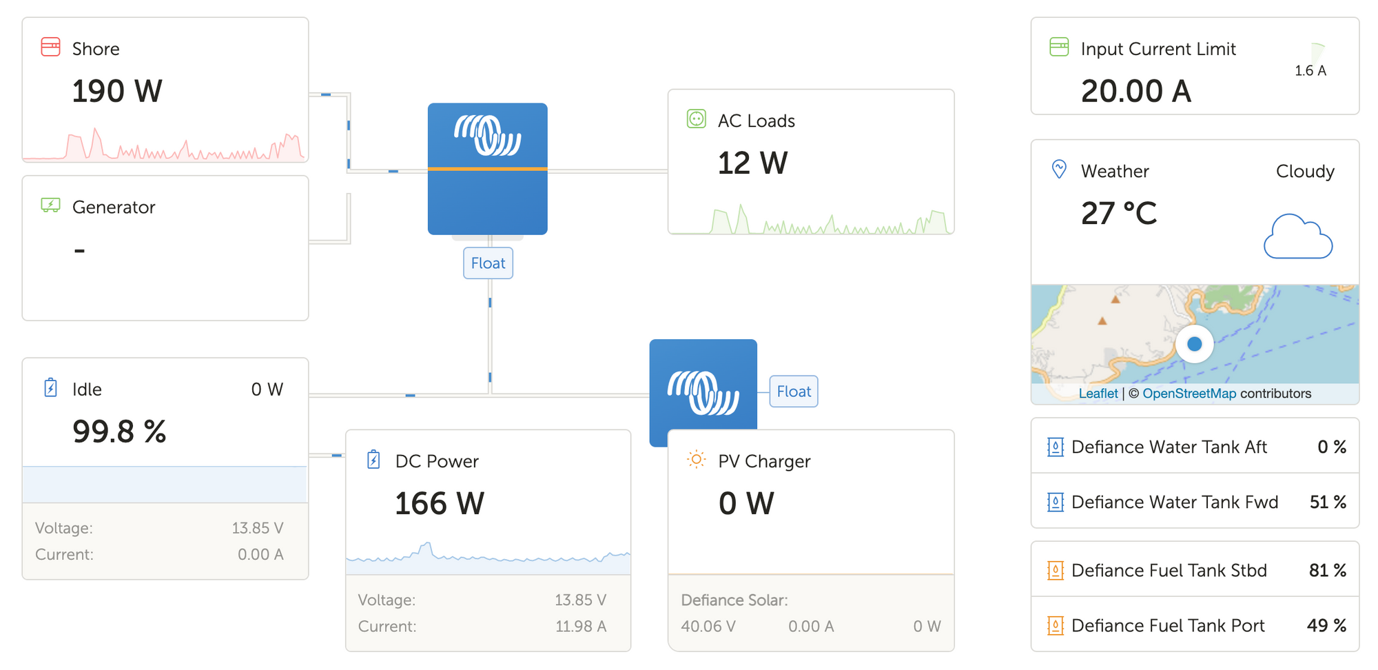 The left side of the dashboard, below, shows most of the Modbus sensors I have coming into Home Assistant. All of this data is available locally, with no internet connection, across any device (laptop, phone, tablet) as well as remotely from any location around the world - as long as the boat does have an internet connection (The subject of a future post).
