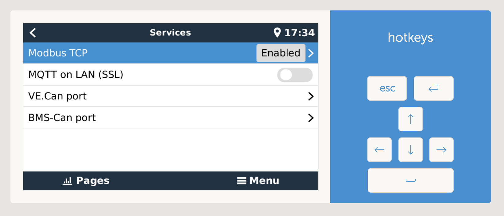 The next step is enabling Modbus. Victron don't assume that everyone will want to use Modbus, so it isn't enabled by default. To broadcast Modbus data to your LAN, you need to enable the feature within the Venus control panel by going to the settings.