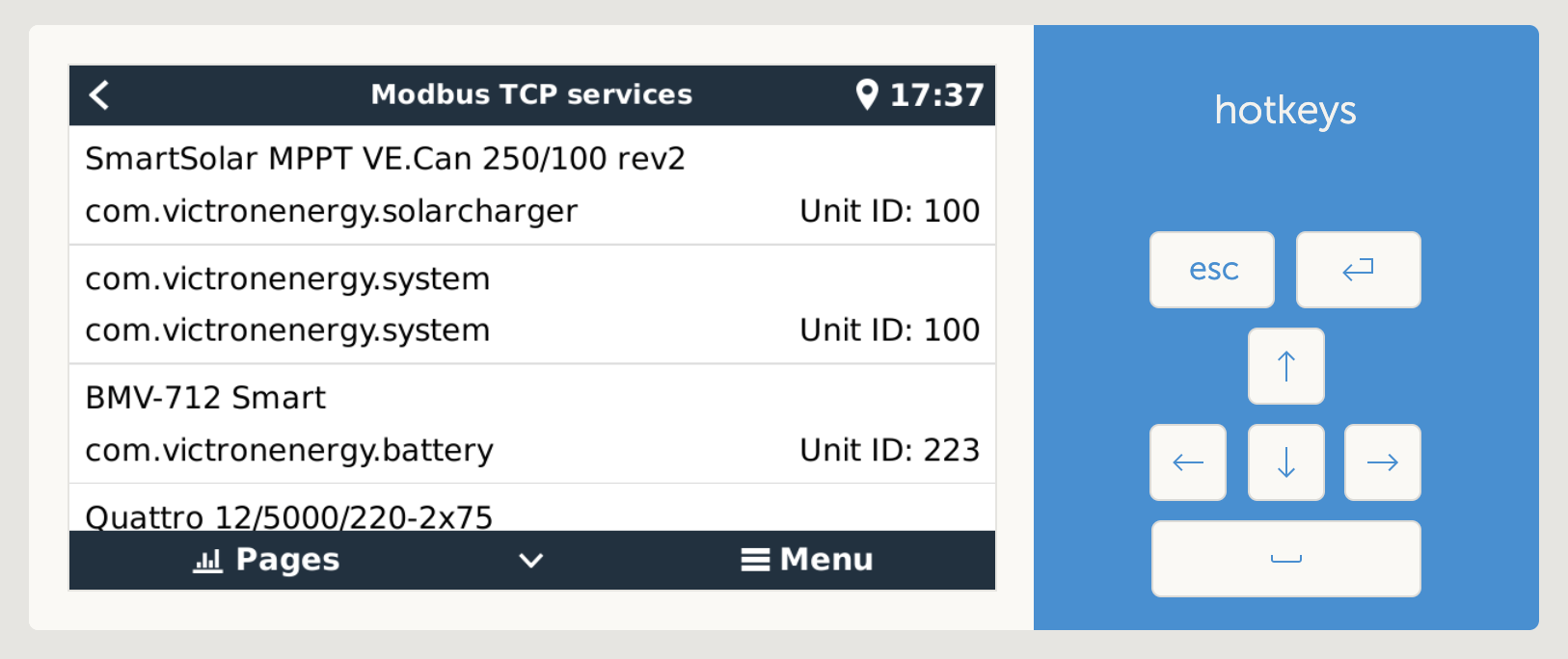 Then you will want to go into the submenu, and make a note of all the Modbus services that are running - and their respective IDs. These will be used for connecting and configuring, later.