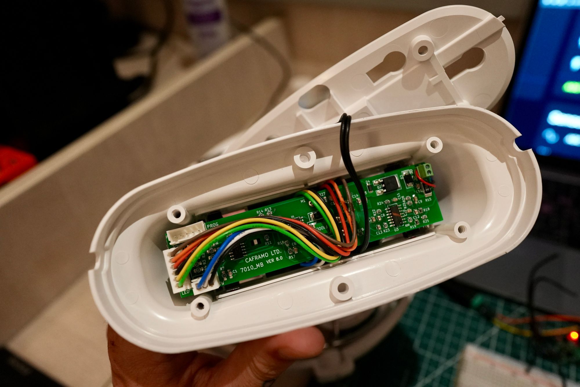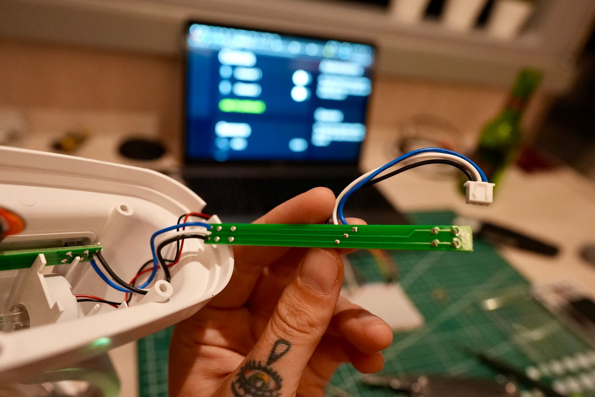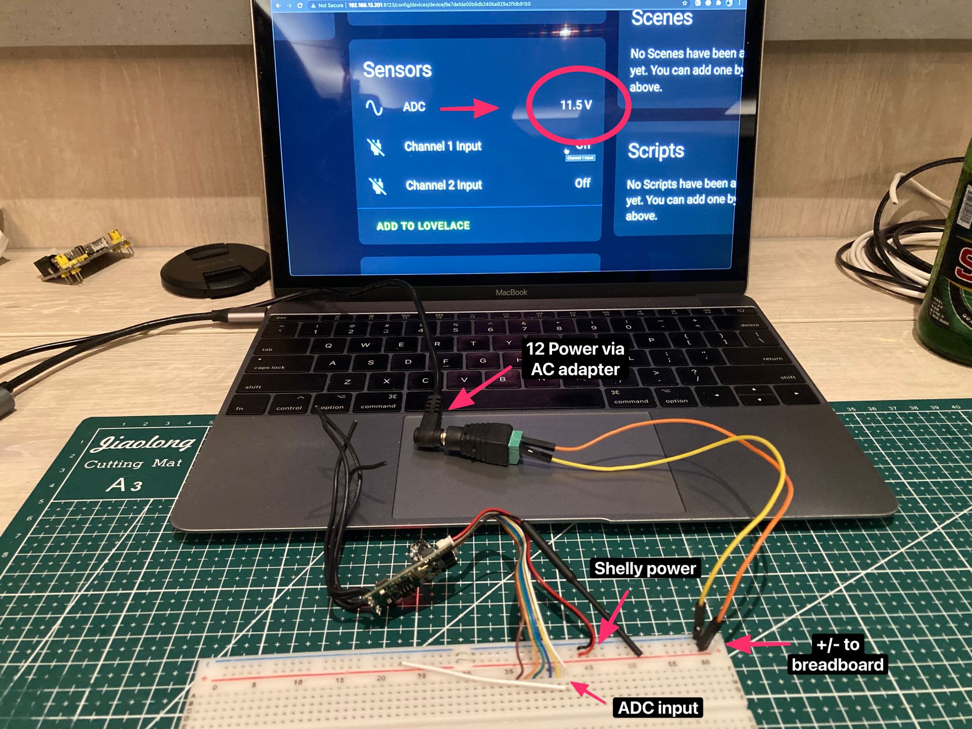 What I missed here was the green wire, which I think needs to go to ground on the board, beside the ADC input, for accurate voltage readings. We'll come back to that.