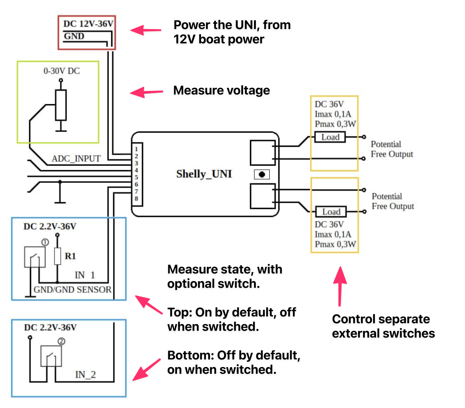 The UNI has a lot of different potential uses, but the main functions I'm interested in are measuring state (on/off) of 12V DC devices on a boat, and doing remote state switching. For example, I'd like to be able to detect if the watermaker is currently running, or remotely turn on/off the Sirocco II fans throughout the boat .