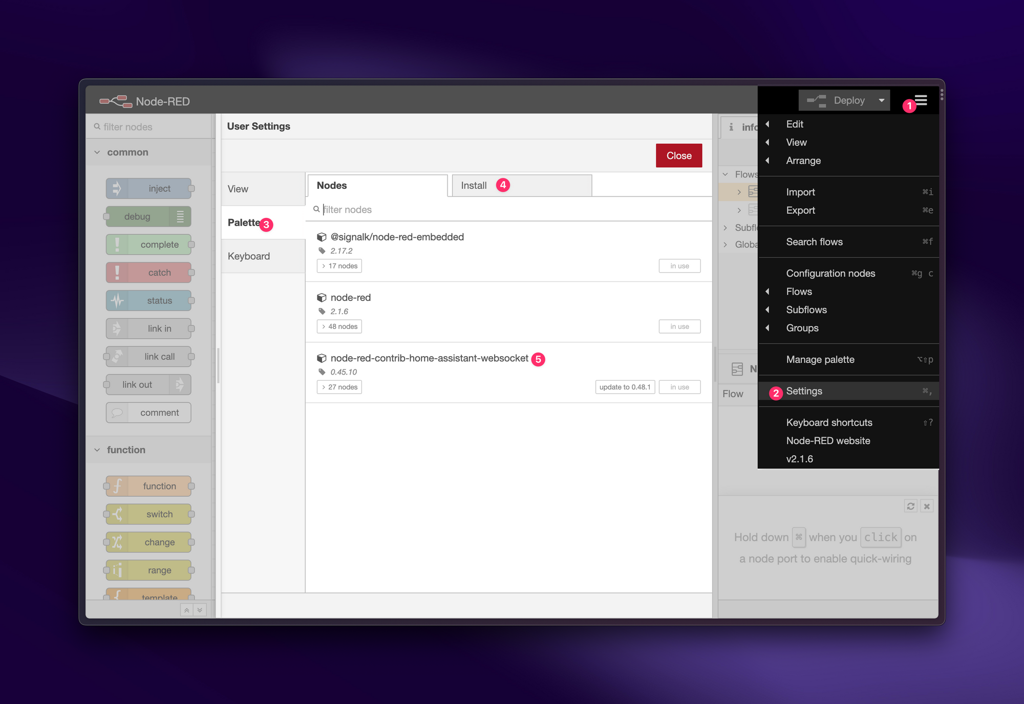 Next you'll install the Home Assistant addon inside Node-RED by going into the menu, selecting Settings → Palette → Install and searching for node-red-contrib-home-assistant-websocket - then click the Install button.