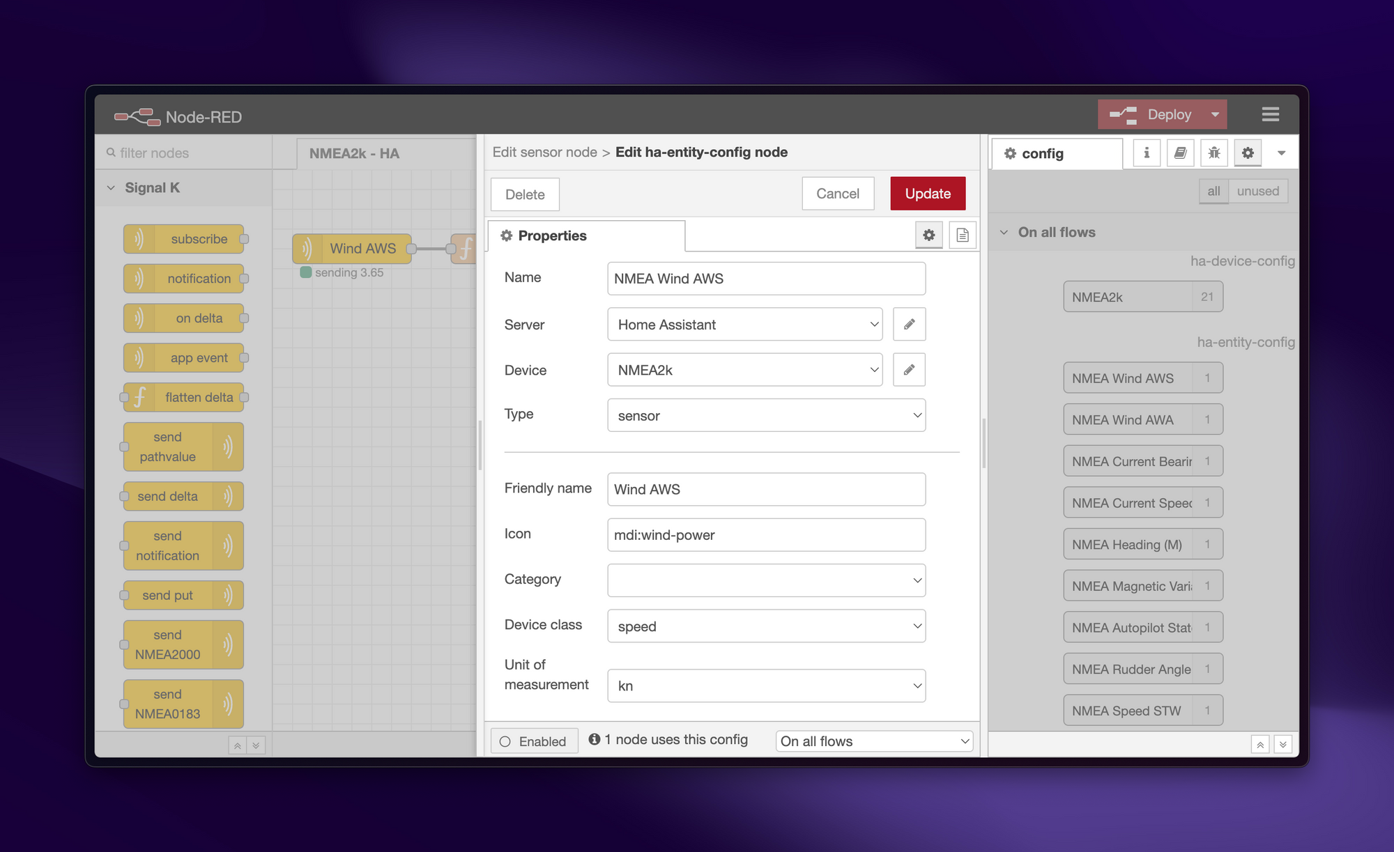 Click on "Update" to save the sensor, and then click on "Deploy" in NodeRED to publish your changes.