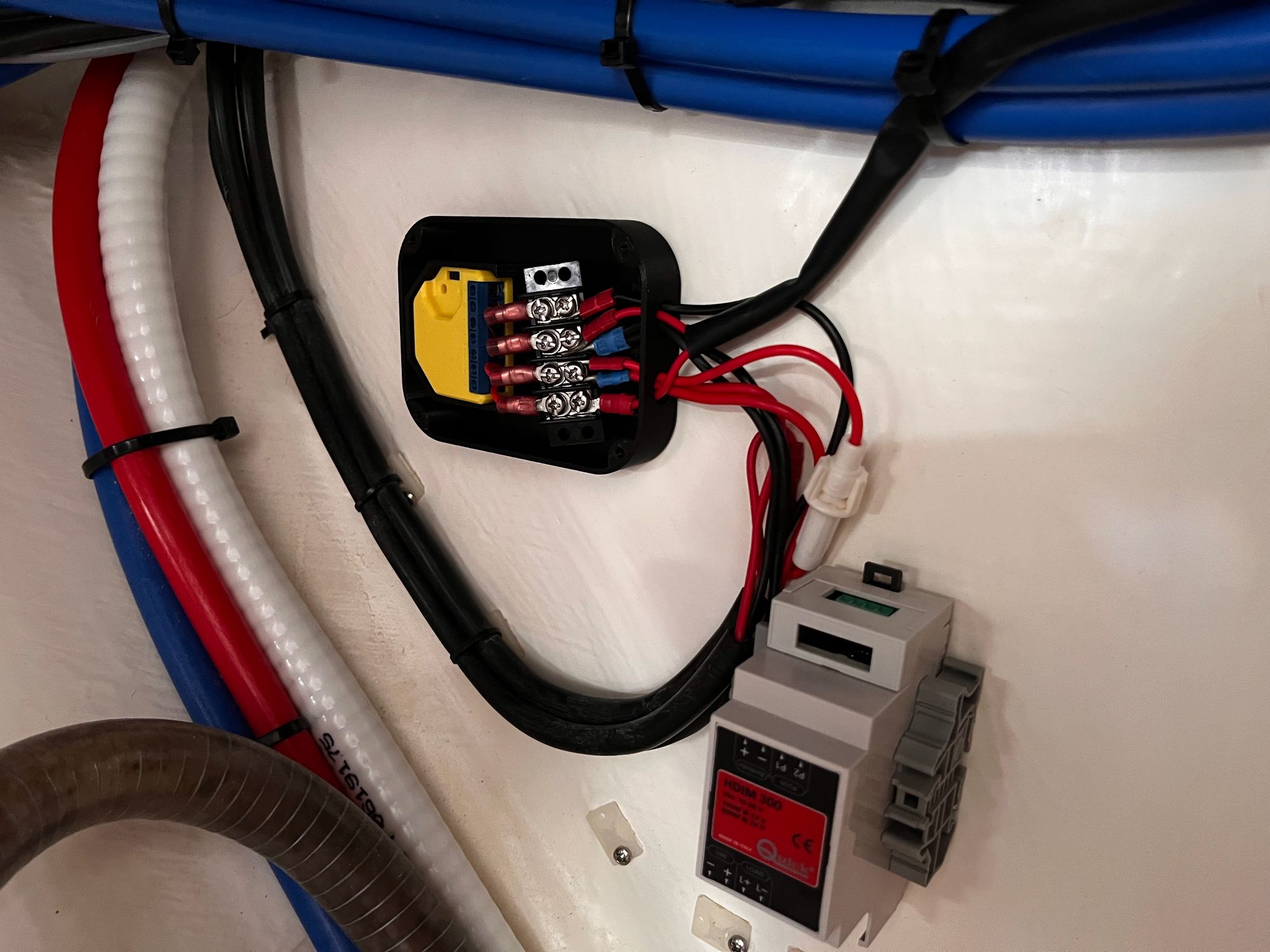 One thing I wasn't sure about: The factory dimmer is a Quick Marine HDIM 300W unit. The Shelly RGBW2 has only 45W per channel. Given such a big deficit, would the Shelly be sufficient to power the length of LED rope lights on the boat? Short answer: Yes. None of the LED strips on our boat draw more than about 36W at peak brightness. It turns out that Quick Marine don't make any other size of dimmer, so the ones installed by the factory are just needlessly oversized.