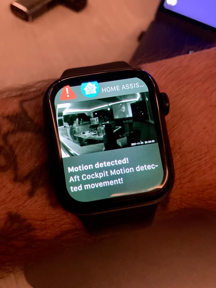 Finally, I found this great Blueprint for Home Assistant which will send a push notification with a photo from the camera when the motion sensor in the aft cockpit is tripped if nobody is home.